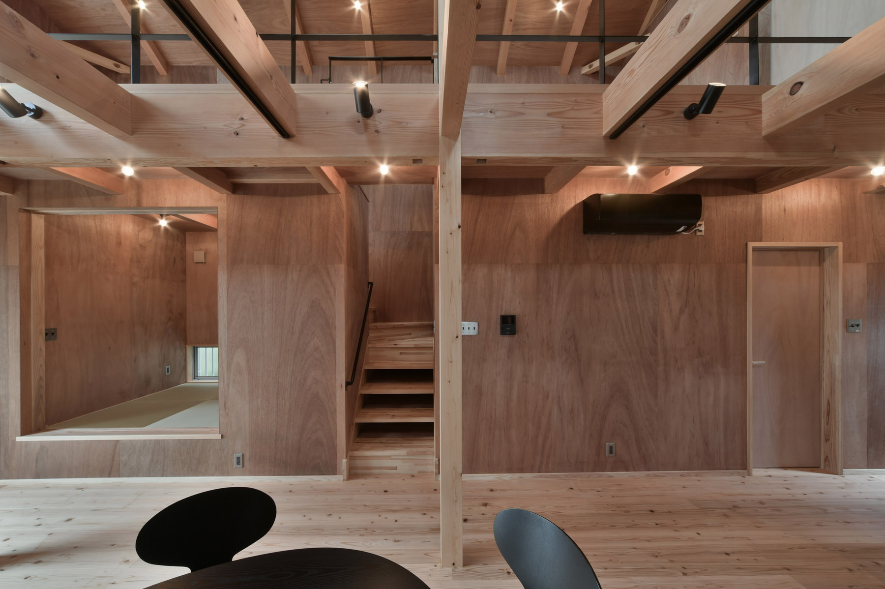 開口部は必要な所に合理的に計画。内部は柱、梁を無骨にあらわし、ラワンベニアで覆われたおおらかで作り込まない倉庫のような空間とし、家族構成の変化に合わせて成長する余白を残した。